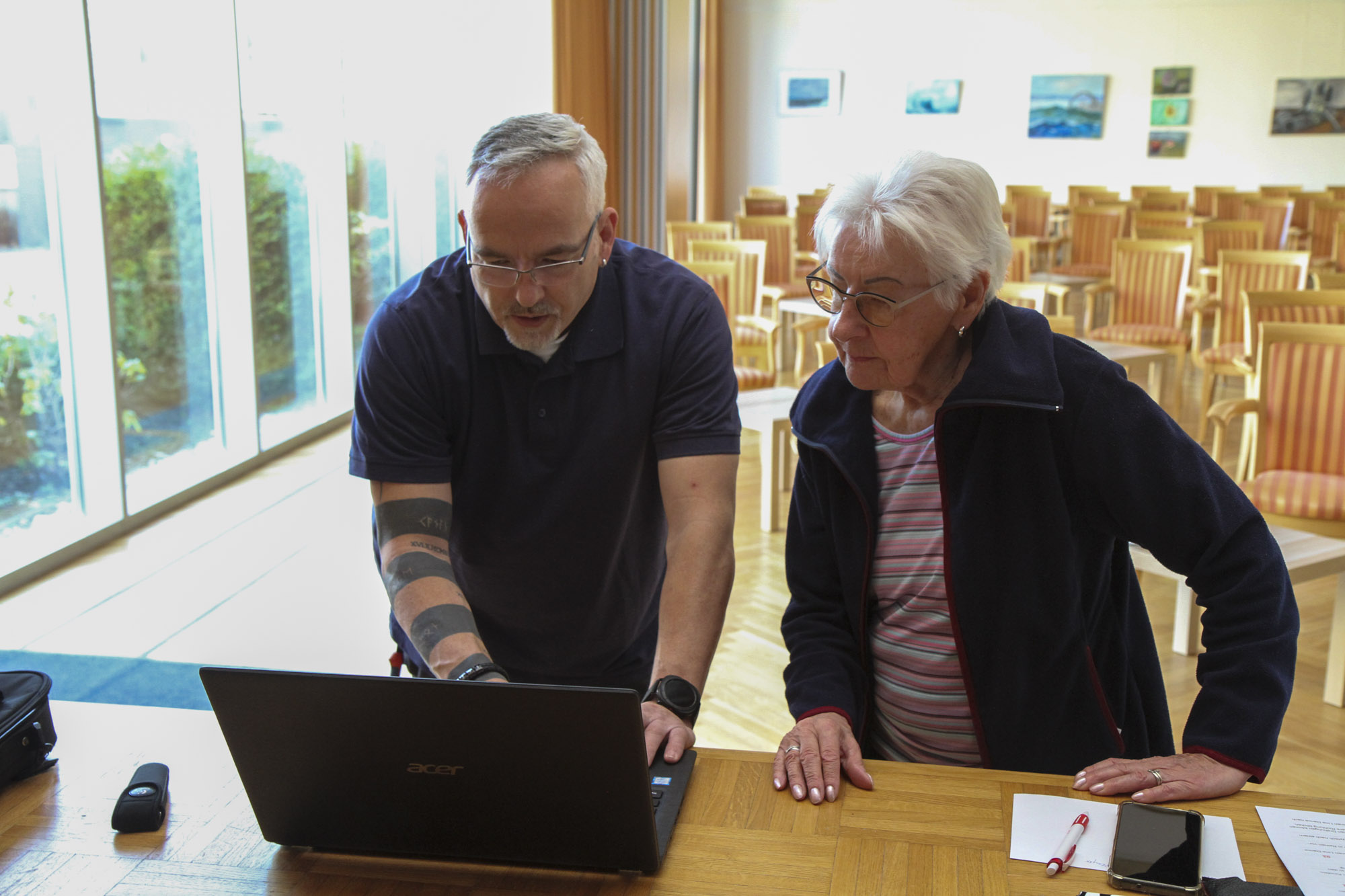 Den Eindruck der Zufriedenheit vermittelt auch Hakan Günay. Der 49-jährige Elektriker arbeitet als stellvertretender Leiter Haustechnik im KWA Stift im Hohenzollernpark. Im Festsaal steht er gemeinsam mit Bewohnerin Margit S. und Brigitte G., Fachbereichsleiterin Gymnastik und Tanz bei der Berliner Turnerschaft. Beide Damen werden in Kürze an einer Tanzveranstaltung mehrerer Gymnastikgruppen der Berliner Turnerschaft im Festsaal teilnehmen. Vor Hakan steht ein Laptop, aus den Lautsprechern links und rechts erklingt „You’re the one, that I want“, der Hit von John Travolta und Olivia Newton-John aus dem Musical „Grease“. Der Haustechniker zieht die Stirn kraus. Es geht um die Zusammenstellung von Musikstücken für die Tanzdarbietung. Aber die Technik hakt, trotz eigens eingerichtetem WLAN-Hotspot. Hakan muss eine Liste erstellen, aus der jeder Song auch einzeln gestartet werden kann. Margit S. und Brigitte G. blicken dem sympathischen Haustechniker geduldig über die Schulter. „Ich probiere noch etwas anderes aus“, sagt Hakan Günay und stellt ein Digitalradio auf die Bühne, in das er einen USB-Stick steckt. Das ist die Lösung! Jeder Song lässt sich nun auch direkt ansteuern. „Der Techniker ist einfach unverzichtbar“, sagt die 78-jährige Margit S. – und Hakan schmunzelt. Es sind solche kleinen oder auch größeren Einsätze im Haus, die seinen Arbeitstag bestimmen.