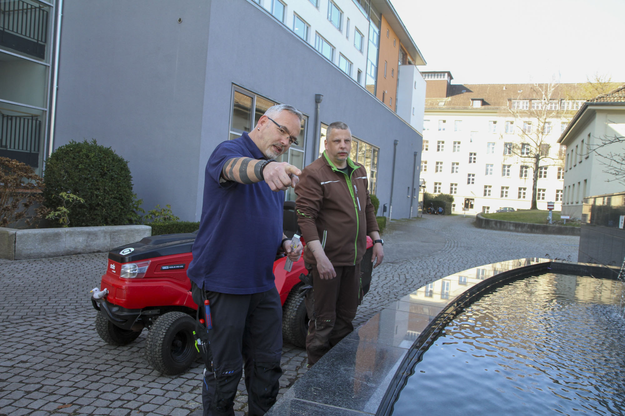 „In der Haustechnik sind wir zu zweit. Dazu kommt unser Gärtner Bernd Neumann, der uns immer mal wieder unterstützt. Und wenn es um die Elektrik, um sanitäre Probleme oder auch kleinere Malerarbeiten geht, sind wir zur Stelle. Ich arbeite gerne hier. Man muss flexibel sein. Aber genau das macht ja oft auch den Reiz aus“, berichtet er. Wenig später steht er am Brunnen vor dem Haus und überprüft die Auslaufrinnen. Am Tag davor hat er gemeinsam mit Bernd Neumann die Wasserpumpe repariert. Keine Minute später fährt der Gärtner auf seinem Rasentraktor vor. „Läuft alles?“, fragt Bernd und steigt ab. „Läuft“, erwidert Hakan. Sein Kollege steht kurz darauf schon wieder im Stiftspark und beschneidet Hecken. Auch Bernd Neumann ist bereits seit über zehn Jahren im Charlottenburger Wohnstift tätig. Er pflegt den Stiftspark mit den Bänken und Minigolf-Bahnen, vertikutiert, mäht den Rasen und pflegt den Teich.